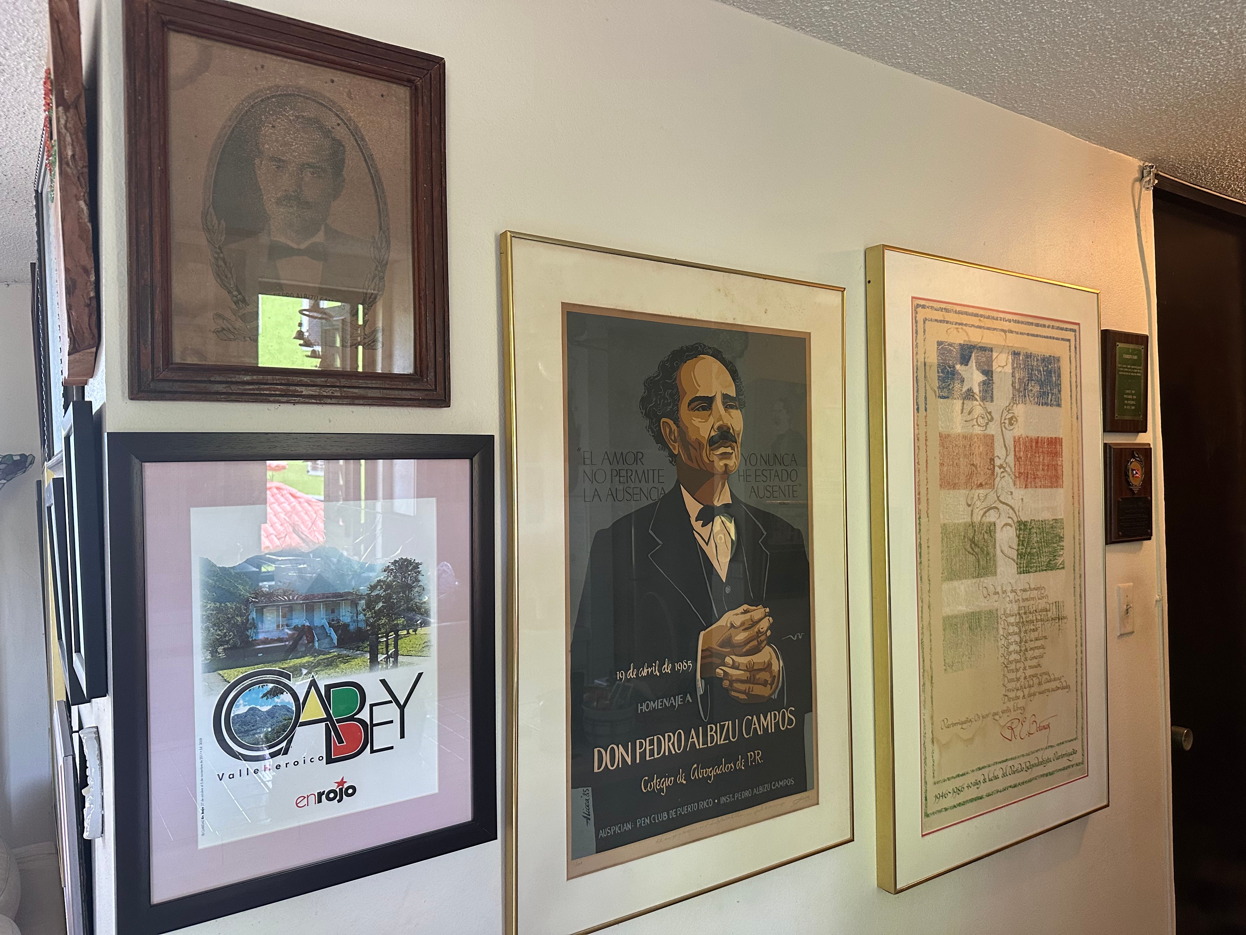Este comedor, donde Heriberto se sienta en una silla acolchonada alrededor de una mesa redonda llena de anotaciones, calendarios, discursos y libros, podría transformarse en un museo de la independencia puertorriqueña. En sus paredes cuelgan los homenajes a los próceres que se animaron a luchar por un pueblo libre y a las batallas que protagonizaron: están los diez mandamientos de los hombres libres de Ramón Emeterio Betances; la desgarradora carta Las Manos en el cristal que Oscar López Rivera le escribió a su nieta Karina en una tarde cualquiera de sus 35 años de encarcelamiento hasta su libertad en 2017; el recuerdo del alzamiento conocido como el Grito de Lares que el 23 de septiembre de 1868 intentó la emancipación de la corona española; la bandera monoestrellada firmada por Lolita Lebrón, Irvin Flores, Rafael Cancel Miranda y Andrés Figueroa, un cuarteto que el 1 de marzo de 1954 tiroteó el Congreso de Estados Unidos para exigir la independencia puertorriqueña; y decenas de retratos de Pedro Albizu Campos.
